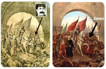 Zonaro’nun Hasan Rıza Bey’den bire bir kopya ettiği eserler arasında en meşhûru Koca Fatih’in Topkapı surlarından kıratı üzerinde İstanbul’a girişini gösteren “Fetih” tablosudur.
