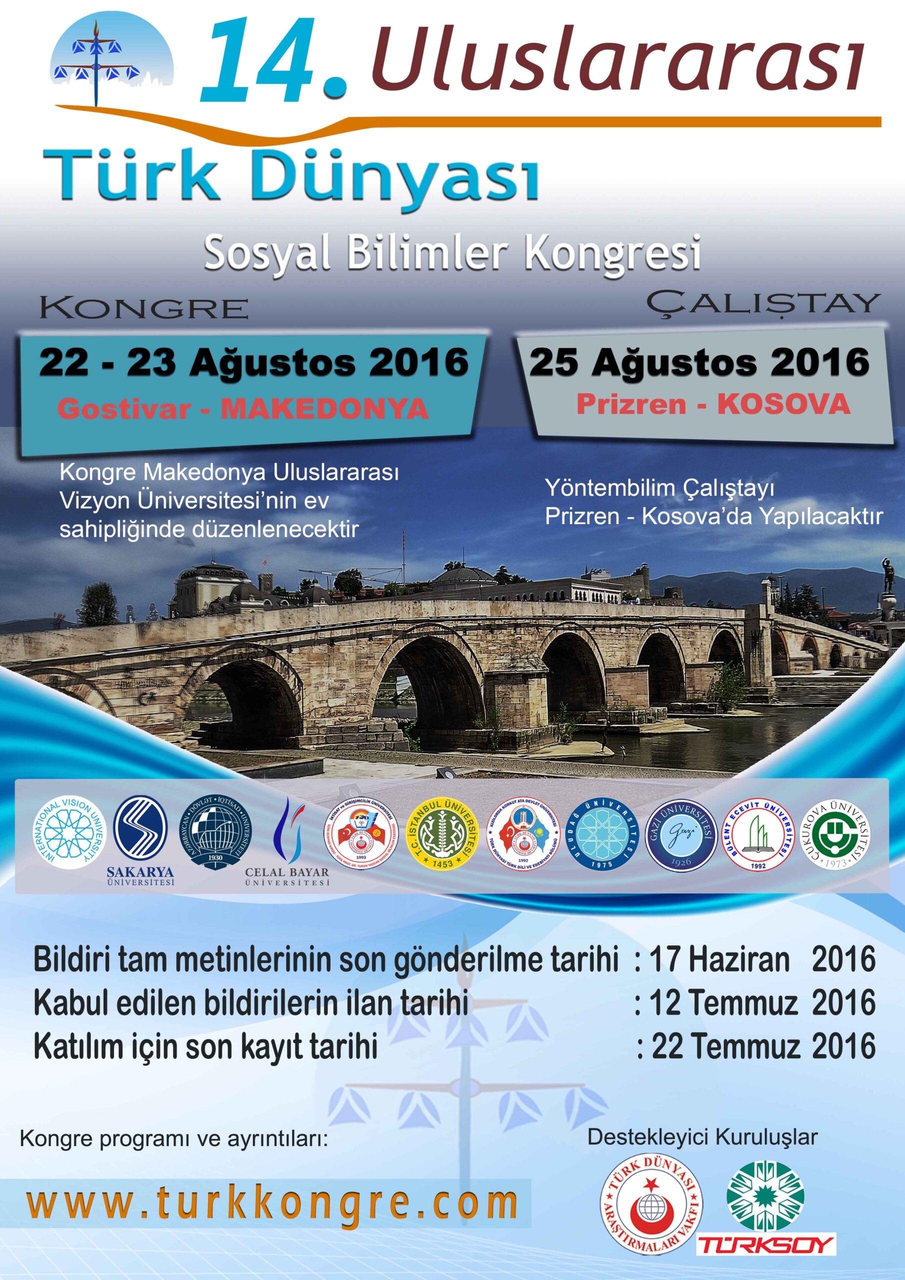 Uluslararası Türk Dünyası Sosyal Bilimler Kongresi rahmetli Prof. Dr. Turan YAZGAN’ın hocamızın önderliğinde 2003 yılında düzenlenmeye başlanan, Türk Dünyası’nda akademik, sosyal, eğitim ve ekonomik anlamda işbirliğini hedefleyen uluslararası katılımlı bir kongredir. Kongremizde sosyal bilimlerin her alanında bildirilere yer verilmekte ve Türk Dünyasının değişik bölgelerinde her yıl düzenlenmektedir. 2015 yılında yaklaşık 15 farklı ülkeden onlarca Rektör, Rektör Yardımcı, Dekan ve yaklaşık 200 seçkin akademisyenin katılımı ile Azerbaycan Bakü’de düzenlenen kongremiz bu yıl, 22-23 Ağustos 2016 tarihleri arasında Evlad-ı Fatihan toprakları olan Makedonya Üsküp – Gostivar’da Uluslararası Vizyon Üniversitesi’nin ev sahipliğinde düzenlenecek, devamında 25 Ağustos 2016 tarihinde Prizren─Kosova’da Yöntembilim Çalıştayı düzenlenecektir. Kongre bilgileri ilgili bağlantılarda verilmektedir.