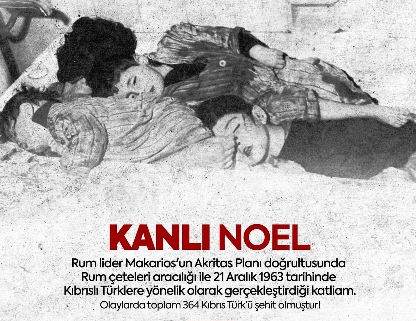 KANLI NOEL /Kumsal Baskını (24 Aralık 1963-23 aralık 1963 ateşkesine rağmen ; Yunan subayı Terezepulos’un 150 kişilik çetesi Lefkoşe Kumsal bölgesine baskın yaptı. Kıbrıs Türk alayı subayı Dr. Bnb. Nihat İlhan’ın hanımı ve yaşları 2-10 arasında değişen üç çocuğu ile evde misafir olan 3 kişiyle birlikte makinalı tabancalarla vahşice şehid edildi)