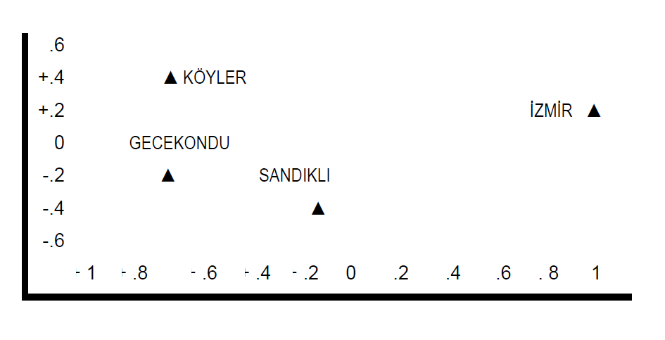 Grafik-l’e bakıldığında yatay eksende, İzmir merkez grup ile diğerleri arasında bir kopma gözleniyor. Ancak Sandıklı grubu gecekondu grubuna kıyasla İzmir merkez gruba daha yakın bulunuyor. En yüksek değeri köylerin aldığı dikey eksende, Sandıklı ve gecekondu grubu arasında bir yer değiştirme olduğu gözleniyor. Dikey eksen bir tür ‘tüketim motivasyonu’ veya ‘tüketim dispozisyonu’dur. Burada köy grubu, sahip olduklarının görece azlığı nedeniyle tüketmeye daha ‘aç’ ve ‘meyilli’ görünüyor. İzmir merkez grubu ise alıştığı yüksek konfor ve refah düzeyinin gereğince tüketme motivasyonu yüksek bir grup portresi çiziyor.