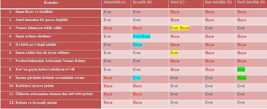 Yukarıdaki açıklamalar ışığında tablo dikkatle gözden geçirilirse Eş’arilik ile Matüridiliğin iki konuda farklılaştığı bunun dışındaki konularda birbirine çok benzediği görülür. Osmanlı’da bu iki mezhebin Osmanlı dini düşüncesinde neden çok yakın olarak yan yana durduğunu şimdi sanırım daha iyi anlayabiliriz. Elbette bu bizim sınırlarımız için doğrudur. Yoksa bu iki ekolün tamamen birbirine yakın olduğu anlamına gelmez. Burada yer alan konular daha çok onların Selef ve Selefilikten neden ve nasıl ayrıldığını anlatmak için seçilmiştir. Bu açıdan bakıldığında yöneticiye isyan dışında Selef ve Selefilik ile Eş’arilik ve Matüridiliğin birbirinden tamamen farklı oldukları görülür. Bu da bize niçin Selef ve Selefiliğin kelam mezheplerine karşı olduğunu anlamamızı sağlar. Bu nedenle Eş’ari ve Matüridi Ulema tarafından 19. yüzyıla kadar “Ehl-i Sünnetin iki imamı vardır: Eş’ari ve Matüridi” şeklinde bir genel jargon yaygınlıkla kullanılmıştır. Bu gün ise bu genel kullanım diyanetin ilmihali de dahil olmak üzere “Ehli sünnet mezhepleri: Selefilik, Eş’arilik ve Matüridilik” şeklinde değiştirilmiştir. Şimdi okurun yukarıdaki tabloyu yeniden gözden geçirip, kendisi bir mezhep bile olmayan daha çok Selef denilen alimlerin görüşlerinin politize edilmesinden müteşekkil olan Selefiliğin nasıl olup da Sünnilik içine dahi edildiğini sorması gerekir.