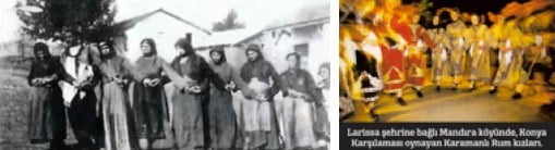 Solda, mübadeleden evvel Kayseri Gesi bağlarında halay çeken Karamanlı Rum kadınları. Sağda, bugün Larissa’da Konya karşılaması oynayan Karamanlı Rum kızlar