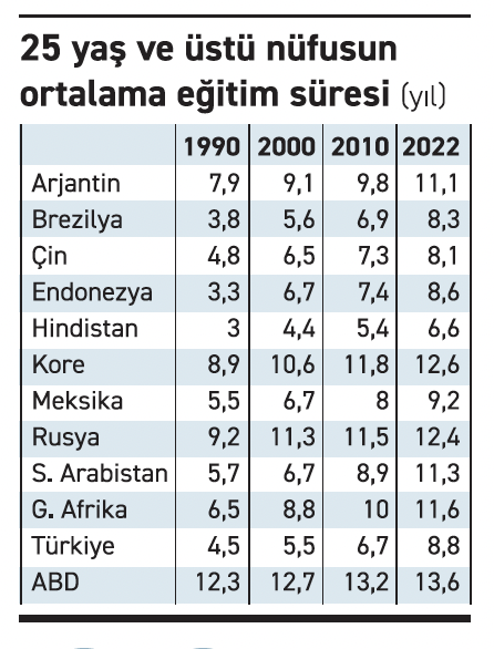 Birleşmiş Milletler, Beşeri Gelişmişlik Endeksi yayınlıyor. Endeksin üç alt bileşeni var: Sağlık, eğitim ve hayat standardı. Sağlık doğumda yaşam beklentisi ile ölçülüyor. Eğitimin iki alt kalemi var: Yirmi beş yaş ve yukarısı nüfusun eğitim süresi ve yeni okula başlayan bir çocuğun alması beklenen eğitim süresi. Hayat standardı ise kişi başına milli gelir ile ölçülüyor. En son 2022 yılı verileri var. Yirmi beş yaş ve yukarısı nüfusumuzun ortalama eğitim süresini, içinde bulunduğumuz G20 ülke grubundaki yükselen piyasa ekonomilerin değerleri ile tabloda karşılaştırıyorum. Ayrıca bir fikir versin diye gelişmiş ülkelerden Kore ve ABD verilerine de yer veriyorum. Türkiye’nin durumu açıkça iyi değil. Kore’de ortalama eğitim süresi 12,6 yıl iken Türkiye’de 8,8 yıl: Müthiş bir fark. Kaldı ki, bu karşılaştırma sadece niceliği yansıtıyor, niteliği değil. Nitelik için OECD’nin PISA sınav sonuçlarına dönüyorum. Son veri 2022 yılına ait ve öğrencileri sınava katılan ülkeler arasında Türkiye’nin matematik, ana dilde okuma ve fen bilimleri sınavlarında aldığı puanlar, ortalama puanların altında yer alıyor. Okul öncesi eğitime katılım oranında ise OECD içinde Meksika ile birlikte son sıradayız.