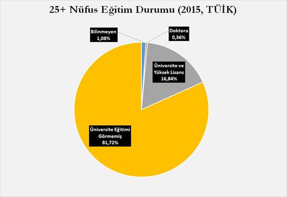 Önce şunun altını çizelim. Türkiye’de ortalama eğitim seviyesi 6.5 yıl, yani ortaokul terk. Böyle bir iklimde bilim yapmak, akademisyen olmak için gerekli olan doktora derecesi sahibi olmak tahmin edersiniz ki bin bir engeli aşarak mümkün oluyor. Nitekim Dr. Emrah Aydınonat’ın en son TÜİK verilerinden yola çıkarak paylaştığı aşağıdaki grafikten de göreceğiniz gibi 25 yaş üstü nüfusta doktora derecesine sahip olanların oranı yalnızca % 0.36. Bir fikir vermesi açısından İsveç ve İsviçre gibi ülkelerde bu oran bizim 10 katımızdan daha fazla ama 1980lerde bizimle aynı yerde olan Güney Kore’de de bu oran bizim 3 katımız seviyesinde. Ülkenin en iyi eğitilmiş kesimini bırakın el üstünde tutmayı, her gün rezil ediyoruz. Bilimi ve o bilimii yapanları bu kadar hırpalayarak sadece o insanlara değil aslında kendimize ve daha önemlisi çocuklarımızın geleceğine büyük bir darbe vuruyoruz.