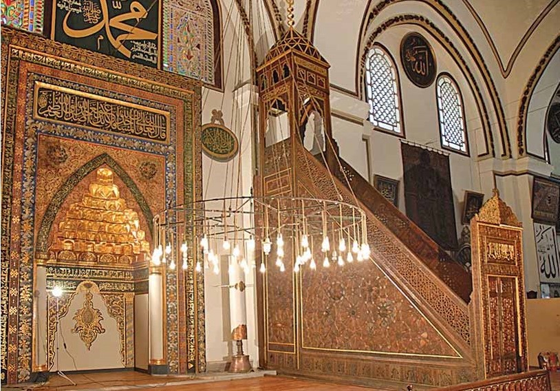 Minberin Taç Kapısı ve Caminin Yapılış Tarihi Minberin kusursuz ve hakikaten sanatkarane bir işlikle yapılmış taç kapısı üzerine ceviz ağaca oyarak kalem-i muhakkak ile yazılmış kitabede, minberin yapılış tarihi ve yaptıranı belirtilmektedir. “Mimma amile bi-resmi’s-Sultan-i’l Muazzam Bayezid bin Murad Han bi-tarihi isneyn ve sema-nemie”. Yani “Bu eser Murad Han oğlu büyük Sultan Bayezid Han’ın Emriyle 802 tarihinde yaptırılmıştır.” deniliyor. Bu hicri tarih, caminin miladi olarak 1399 yılında yapıldığını gösteriyor. Minber bütünüyle kainatı sembolize ediyor. Minberin giriş kapısının üzerindeki kitabede altın yaldızla Osmanlıca olarak, ‘Yıldırım Beyazıt Han tarafından hicri 804 (miladı 1402) yılında yaptırılmıştır’ ibaresi yer alıyor. Sarmaşık motifleriyle süslü olan tırabzanların sağ çıkış ikinci kolonu üzerinde süsleme motifine uygun sülüs tarzda yazılmış, Devaklı Abdülaziz oğlu Mehmet işi ibaresi dikkat çekiyor. Sanatkarın bu imzası son yıllarda fark edildi.  Minberin doğu cephesinde, biri dar dikdörtgen, diğeri alanı daha geniş üçgen biçiminde, bir diğeri en altta şerit halinde uzanan taşıyıcı dolap serisi banko olmak üzere birbirine bitişik üç kompozisyon alanı bulunuyor. Üçgen ve dikdörtgen yüze ikisi birlikte Güneş Sistemi’nin kabartma formlarla işlendiği bir alan var. Gezegenlerin her biri yörünge hareketleriyle birlikte küresel kabartma motifler halinde Güneş’e olan uzaklık ve aralarındaki büyüklük karşılaştırmaları da verilerek olması gereken yerlerde. Gezegenler, Merkür, Venüs, Dünya, Mars, Jüpiter, Satürn, Uranüs, Neptün, Pluto şeklinde olan Güneş’e uzaklık sıralaması da doğru. Büyüklük mukayesesi de baz alındığında Dünya’dan elli bin defa daha büyük olan Güneş, büyük bir ustalıkla mükemmel şekilde işlenmiş durumda. Anlaşılacağı üzere dünyanın yuvarlak olup olmadığının bile tartışıldığı bir devirde bir ahşap işçisi bile o dönemde bilinen tüm gezegenleri rastgele bir yıldız olarak değil, güneş sistemimizdeki birer gezegen olarak işlemiş.