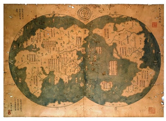 Zheng He’ye ait 1418 tarihli dünya haritası uzun zamandır araştırmacıların ve bilim adamlarının ilgisini çekmektedir. Amerika KıtasınınBatılılar tarafından keşfinden çok önce bu Müslüman gemicinin çizdiği veya kullandığı haritada eski dünya ile birlikte Kuzey ve Güney Amerika ve Antarktika kıtaları da gerçeğine yakın olarak gösteriliyor[9].
