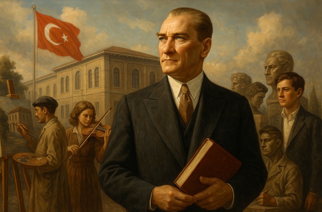 Cumhuriyetin Osmanlıdan devir aldığı kamusal devlet düzeni, 1789’da Fransa’da başlayarak bütün Avrupa’yı etkisine alan monarşik düzen karşıtlığının Türk milletine yansımasıdır. Sarayın ihtişamına karşılık olarak halkın yaşam biçiminde ciddi anlamda boşluklar bulunmaktadır. Bu boşlukların en büyüklerinden birisi de kültür ve sanat alanında saray dışına taşırılamayan etkinliklerdir. İşte Cumhuriyetin en güzel kazanımlarından biri olan halkın kendi iradesini bulması, başlarda devlet desteğiyle, sonrasında da bireysel çabalarla sanat ortamını hareketlendirmiştir. Yüzölçümü bakımından Türkiye’nin yarısında da küçük olan Almanya veya üçte ikisi büyüklüğünde olan Fransa’nın tanınmış sanatçılarına baktığımızda, neden Türkiye’de de bu denli sanatçılar yetişemedi sorusunu sormadan edemiyoruz? Bugün Dürer’in dünyanın en büyük müzelerinde eserleri varsa, 15 veya 16. Yüzyıl Osmanlısından itibaren Türk ressam yetiştiremediğimizin sorusu, 100 yıllık Türkiye’mizin de cevaplaması gereken sorulardan biridir. Bu soruyu soran ve en güzel şekliyle cevaplayan kişi yine Ulu önderdir. Ne diyor 13 Şubat 1923’te? “Bulunmamız gereken seviyeye bu kadar uzak kalışımızın mühim sebeplerinden biri, sanata ve sanatkârlara lâyık olduğu derecede önem verilmemiş olmasıdır.” Diyor. Bu durumu eksiklik olarak görmekle kalmıyor, bulunduğumuz konumda oluşumuzun sebeplerinden biri olduğunun altını çiziyor.