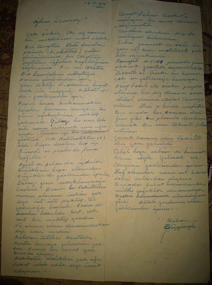 Çocuk zammı için fakülteden yazı gelmedi. Celal beye selam ve hürmetlerimi söyle. Yılmaz ve Cengiz’in gözlerinden öperim. Sağ olsunlar sana ait havadisleri onlardan alıyoruz. Burada Şubat başından beri müthiş soğuklar devam ediyor. Başka havadislerimiz olmadığına göre. Allah yardımcın olsun Gözlerinden öperim