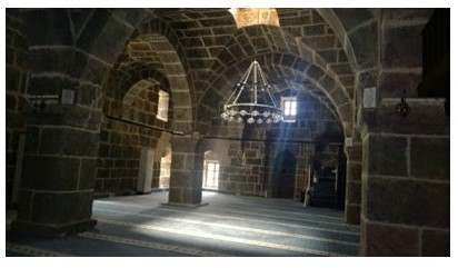 Cami, tamamen taş yapıda olup, caminin inşasında çivi ve demir kullanılmaması ve gözle görülür taş ustalığı ziyaret edenleri hayranlık içerisinde bırakmaktadır. Güney kısmındaki altıgen mihrap çıkıntısı ile son cemaat yerinin kuzeyindeki çeşme yapıya güzellik katmaktadır. Derin niş biçimindeki çeşme, beş sıralı mukarnaslarla bezelidir. Mahfil kapısı ise, mukarnaslar dışında yalındır. Ana mekandan daha yüksek olan son cemaat yerinin en önemli bölümü, doğudaki içiçe iki niş biçimindeki taç kapısıdır. Tonoz örtülü son cemaat yerinden taç kapıyla yine tonoz örtülü üç bölümlü ana mekana girilir.