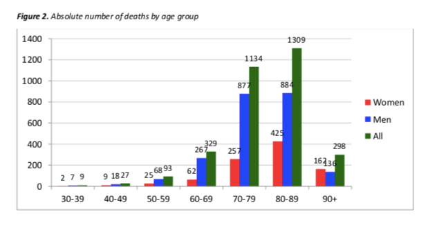 COVID-19 infeksiyonu nedeniyle ölenlerin ortalama yaşı 78.5 yıl (ortanca 80), sınır yaşlar 31-103 yıl arası. Ölüm yaş ortalaması, hasta olma yaş ortalamasına göre 15 yıl yüksek.