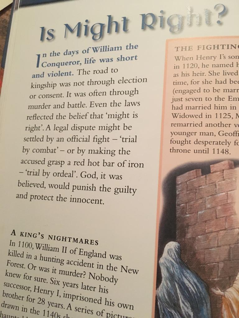 “William çağında (Mîlâdî 11. Yüzyıl) İngilterede hayat kısa ve çetindi. Hükümdarlık yolu seçim veya uzlaşma ile değildi. Bu iş, genellikle, cinâyet ve savaşla olurdu. Öyle ki, kanunlar ‘might is right’ inancını yansıtır.”