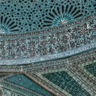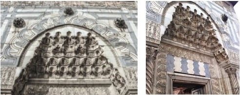Medresenin taçkapısındaki iki renkli taş ve iç mekânlardaki görkemli çini bezemeler dikkat çekicidir.