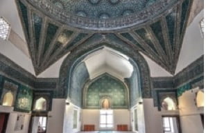 İç mekânı zenginleştiren çini mozaik bezemelerde turkuvaz, lacivert ve patlıcan moru renklerde kesme çinilerle, geometrik ve stilize edilmiş bitkisel motifler uygulanmıştır. Çini dekorasyonda özellikle merkezi mekânı örten kubbenin eğimli iç yüzeyine kaplanmış çiniler hayli etkileyicidir. Burada, kubbe eteğinden başlayarak tepedeki açıklığa kadar dairesel hatlar oluşturacak biçimde yerleştirilen yirmi dört kollu yıldızlar ve aralarda düğümlü şeritlerden ibaret girift bir bezeme yer alır. Kubbe kasnağı ve tepedeki açıklığın etrafına kûfî yazıyla âyetler, üçgen pandantiflerin yüzeylerine yine kûfî yazıyla Muhammed, Ebû Bekir, Ali, Ömer, Osman, Davud, İsa ve Musa isimleri, eyvan kemeri üzerine ise sülüs yazıyla Besmele ve Âyet’ ül-Kürsî yazılmıştır.