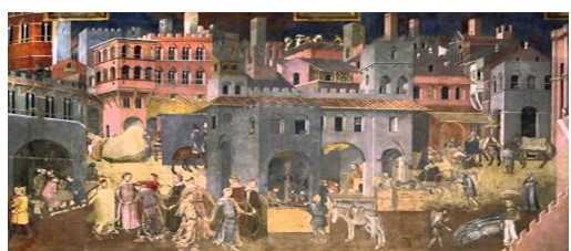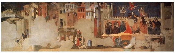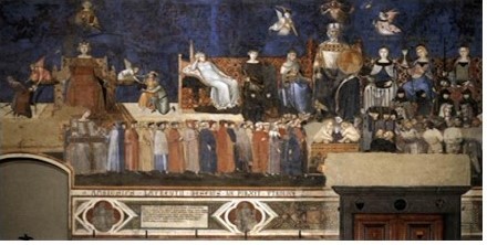 Lorenzetti’nin İyi ve Kötü Yönetim’in Alegori*si adlı eseri Rönesans’tan önce yapılan ilk seküler freskler olarak ön plana çıkıyor.Siena’da Palozzo Publica(Belediye Binası)’nın Barış Odası’nda bulunan freskler günümüze kadar gelen en önemli sanat eserleridir. Dönemin şehir devleti olan Siena’da Kilise ile birlikte 2. büyük güç olarak kabul edilen Palozzo Publica’daki freskler nasıl yönetileceği konusunda bilgi verir. Şehir yöneticilerine Dokuzlar adı verilmiştir ve her 2 ayda 1 yönetim değişerek başka aristokratlar gelir lafı uzatmadan fresklere geçiyorum.