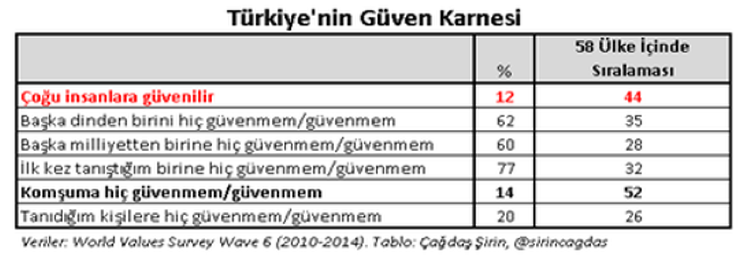 Aşağıdaki tablo bizim son dönem yaşanan toplumsal krizlerin öncesi güven karnemizi özetliyor. Komşusuna güvenenlerin oranı %14, tanıdığı kişilere güvenenlerin oranı sadece %20. Yani altı komşusundan beşine, beş arkadaşından dördüne güvenmeyen bir toplum Türkiye. Ne zaman? 15 Temmuz’dan çok önce. Türkiye son iki yılda dört genel seçimle siyasal kamplara ayrılmadan önceki tablo bu. Elimizde henüz bu karnenin 15 Temmuz sonrası versiyonu yok ama sonucu tahmin edebilmek güç değil.