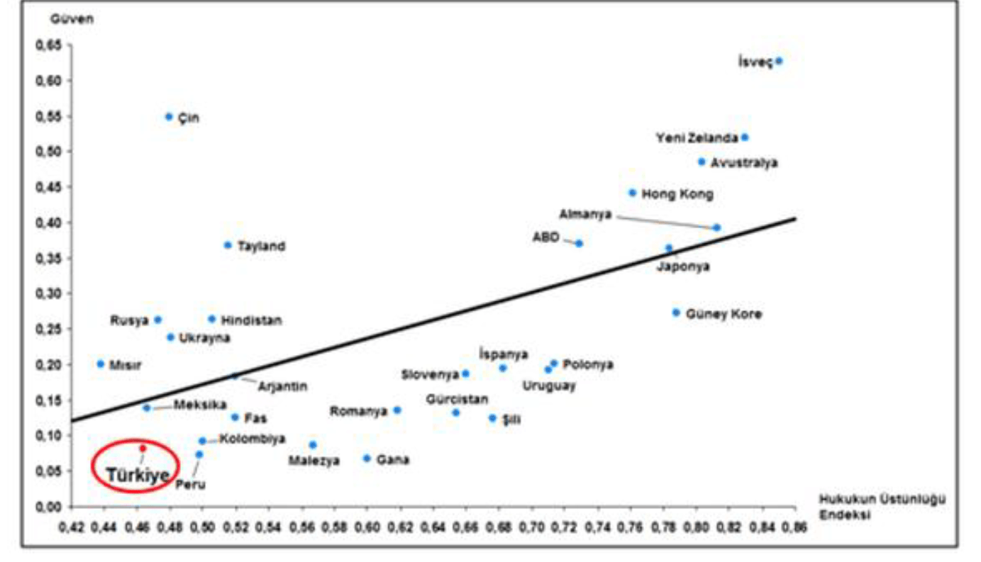 Genç araştırmacı Eser Çağlar yukarıdaki verilerden yola çıkarak “Türkler neden birbirine güvenmez?” sorusuna yanıt aradığı analizinde benim öteden beri iddia ettiğim bir tezi test etmiş. Bu köşenin müdavimleri hatırlayacaktır: Sistem sistem diye andığımız şey, hukukun üstünlüğüdür. O olmazsa ne ekonomik kalkınma ne de toplumsal güven mümkün. Aşağıda Çağlar’ın analizinden aldığım toplumsal güven-hukukun üstünlüğü ilişkisine dair tabloyu paylaşıyorum. Göreceğiniz gibi toplumsal güveni arttırmanın en önemli adımı ülkede hukukun üstünlüğünü tesis etmek. Birini arttırmadan diğerinin artmasını beklemek beyhude. Dahası bu ikisi olmadan sofraya ekmeği koymak mümkün değil. Çünkü yeni girişimler, yeni fikirler ancak birbirine sonsuz güveni olanlar arasından çıkar.