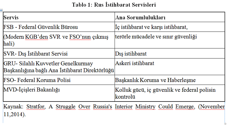 20. yüzyılda Rusya’nın siyasi tarihinde yaşanan önemli değişmeler, Sovyet hâkimiyetinin tesisi, 1980’lerin sonlarından itibaren siyasi sistemin dağılması ve yeni bir sisteme (aynı zamanda rejime) geçiş Rusya istihbarat teşkilatının gelişim sürecindeki önemli kırılma noktalarıdır. 1990-2000 yılları arası Rus istihbarat servisleri için adeta bir çöküş dönemi olur. 2000’li yıllarda Putin ile birlikte yeniden örgütlenen Rus istihbaratı Tablo’lde görülen teşkillerden meydana gelmektedir. FSB, gittikçe Rusların en güçlü istihbarat servisi haline gelir. 30 Haziran 2003’de çıkarılan bir kanunla da dış istihbarat ile ilgili özel bir organ kurma yetkisi verilir.