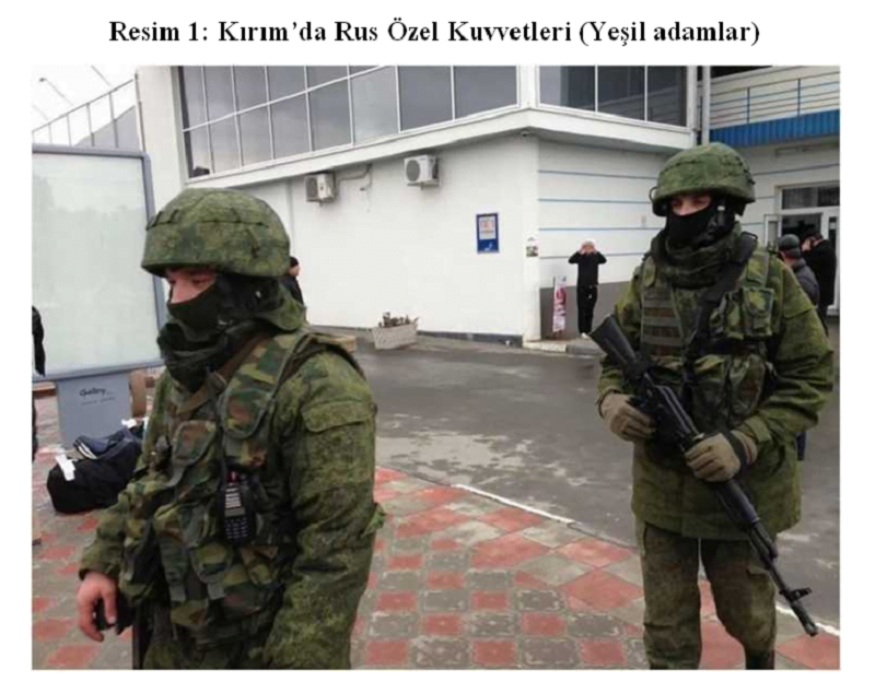 Kırım’ın doğrudan askeri birliklerden önce “yeşil adamlar” denilen silahlı unsurlarca işgal edilmesi bu konsepte binaen uygulanmış bir taktiktir. Kırım’da Rusya yanlısı grupların liderleri İgor Strelkov ve İgor Bzeler, zaten Rus ajanıdırlar[51]. Kısa sürede Kırım’da parlamentoyu, askeri üsleri ve havaalanlarını ele geçirirler. Maskeli ve tepeden tırnağa silahlı kimselerdir. Bunlara, üniformalarının üzerinde herhangi bir işaret taşımadıklarından ve bir anda ortaya çıkmalarından ötürü “küçük yeşil adamlar” veya “yeşil adamlar” adı verilir. Rus Silahlı Kuvvetleri mensubu olduğu bilinen bunların, işgal ve sızma operasyonları için yetiştirilen Kırım’da görevli 346. Bağımsız GRU Spetsnaz Tugayı (özel kuvvet) askerleri olduğu anlaşılır. GRU başkanı İgor Sergun, Ukrayna’nın doğusundaki savaşta Rusya stratejisinin uygulanmasında ve ayrılıkçı liderlerin eylemlerinin koordine edilmesinde büyük rol oynar[52]. Pasaportlaştırma taktiği daha sonra Kırım’da da uygulanır. Kırım, özel kuvvetler tarafından işgal edilir ve tüm stratejik noktalar tutulur. Böyle olduğu bilinmesine rağmen Putin, bir müdahalenin olmadığını rahat bir şekilde söyler. Rusya, Ukrayna ve Kırım’da olduğu gibi yüzlerce “küçük yeşil adam”ı, Suriye’de işleri yoluna koymak ve Esat cephesini desteklemek için gönderir[53].