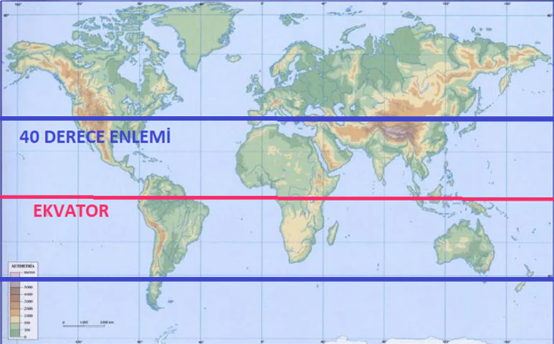 Şekil 1. Dünya fiziki haritası (Ekvator ve 40° enlemleri).