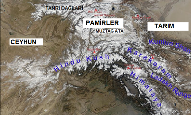 Şekil 10. Pamirlerin Genel Yapısı (Kuzeyinde Tanrı Dağları; Güneyinde Hindikuş Dağları ve Karakurum; Doğusunda Tarım Havzası; Batısında Ceyhun Havzası).