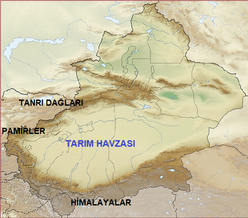 Pamirlerin doğusu Tarım havzasıdır (Şekil 14). Bu bölge Buzul Çağında çok büyük bir göldü ve zaman içinde tamamen kuruyarak Taklamakan Çölü olmuştur. Tarım Havzası batıda Pamirler; güneyde Himalayalar ve kuzeyde ise Tanrı Dağları çevrelenmiştir. Tarım Havzası, 910,000 km² yüzölçümüne sahip Çin‘in uzak batısında Sincan Uygur (Doğu Türkistan) Özerk Bölgesinde, doğudan batıya 1,000 km boyunca uzanan büyük bir elips şeklinde çökelti havzadır. Bu bölge Buzul Çağında çok büyük bir iç denizdi. Divânu Lügati’t-Türk‘te; Tarım sözcüğü göllere, kumluklara dökülen çay kolları şeklinde tanımlanır. 500,000 km²’lik yüzölçümünü Taklamakan Çölü işgal eder. 400,000 km²’lik alan ise tarıma elverişli haldedir. Bu bölge batısındaki Ceyhun ve Seyhun havzasına göre daha az yağış almaktadır. Tibet Yaylası‘nın kuzeyinde bulunur. İçinde Taklamakan Çölünü barındırır. Etrafını çeviren dağ silsilelerindeki vahalarda yerleşim yerleri bulunur. Güneyindeki Himalaya dağ silseleri ve Tibet platosu güneyden gelen mason yağmurlarının daha kuzeye gitmesini engeller.