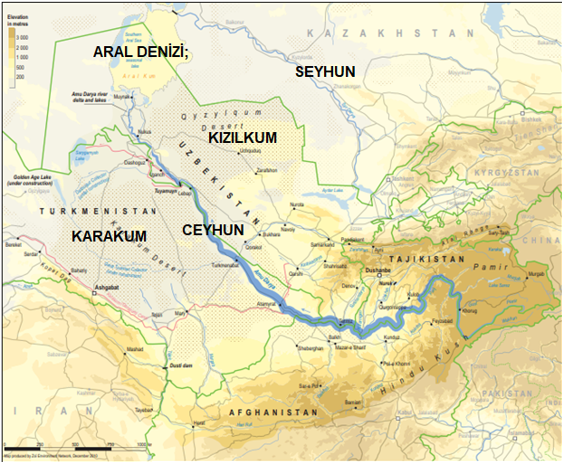 Ceyhun ırmağı Orta Asya‘nın en uzun nehirlerinden biridir (Şekil 15). Ceyhun ırmağı, Afganistan içinde Pamir ve Hindukuş dağlarının kesiştiği yerde, yaklaşık 4950 m rakımdaki kaynağından Aksu (Penç ırmağı) adı altında doğarak batıya doğru ilerler ve kuzeyden, başlıca Pamir Vahan suyu, Kızılsu (Vahş/Uranovodsk), Kâfirnihân ve Surhân, güneyden de Kökçesu kollarını bünyesine katarak Kunduz-Belh hizasında kuzeybatıya dönmektedir. Bu dönüşten sonrası kısmen çöller ve bozkırlar içinde kurak iklim kuşağından geçerek, hiçbir kol kendisine katılmadan kuzeybatı yönünde ilerler ve sonunda farklı kollara ayrılarak Aral gölüne suyunu boşaltır. 2540 km uzunluğundaki nehrin kıyılarında tarih boyunca önemli yerleşim merkezleri kurulmuştur. Aral Denizi’nden itibaren Buhara yakınındaki Çarcau şehri demiryolu kavşağına kadar yaklaşık 1500 kilometrelik kısmında nehir ulaşımına imkân tanımaktadır. Aral Denizi Türkçe’de “Adalar Denizi” demektir. Buzul Çağı sonunda Ceyhun Irmağının doğrudan Hazar Denizi’ne dökülmesi olayını da düşünürsek, belki de Dünya’da ilk suyolu ulaşımı Ceyhun üzerinden Aral Denizi ve Hazar bölgesi olabilir.