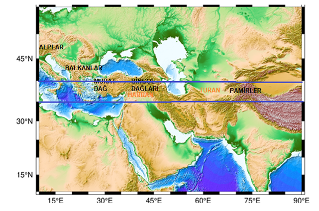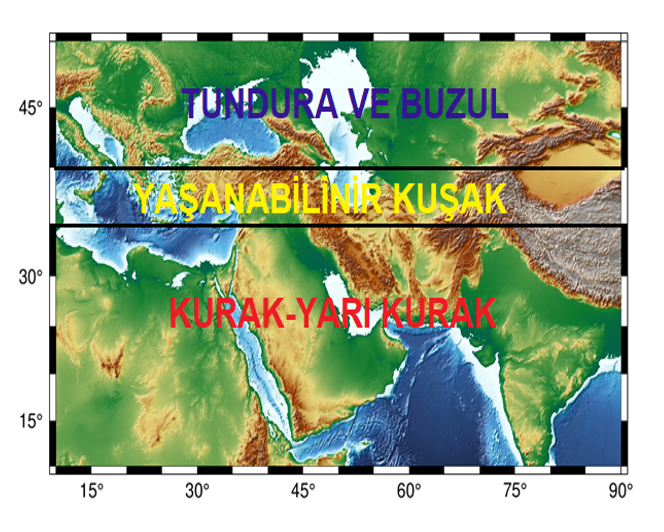 Düşünürümüzün bu sözü, zaman ve mekân ötesi bir tespittir. Coğrafya gerçekten insanın kaderi midir? İnsan mıdır kendi kaderini belirleyen, yoksa yaşadığı doğduğu topraklar mı? Bu bağlamda Tarihi, Coğrafyanın belirlediği olgu içinde ele almalıyız. Dünya fiziki haritası Şekil (1)’de gösterilmiştir. Burada Ekvator ve kuzey 40° K enlemi gösterilmiştir. Çünkü tüm değişimler 40° K enlemi etrafındadır. Yerkürenin Güney Bölümde bu enlemlerde uygun bir coğrafya bulunmamaktadır. Fakat bu durum kuzey yarımkürede Anadolu’dan başlayıp Güney Hazar, Seyhun/Ceyhun, tarım havzası Çin’in Kuzeyinden Kore’ye kadar uzanmaktadır.