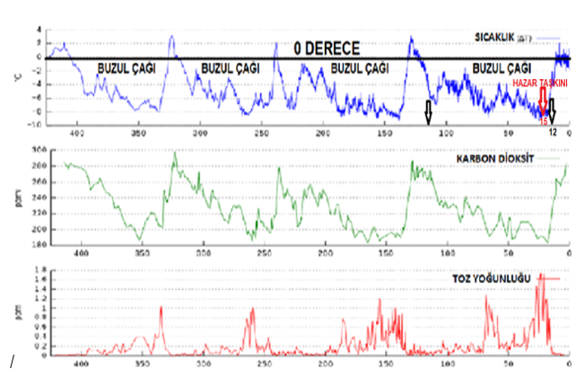 Şekil 19. Antarktika Buzulunda son 400,000 yıldan fazla süre içindeki sıcaklık, CO2 ve toz yoğunluğu değişimleri (Hazar Taşkınları; 15 bin yıl önce)).