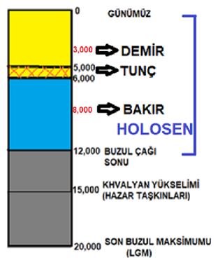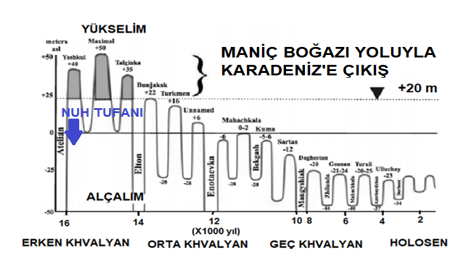İnsanlık tarihini değiştiren olay bundan 15 bin yıl kuzey kutup bölgesini çevreleyen buzul barajının çok büyük bir meteorun çarpması sonucu Hazar taşkınları olmuştur. Dünyanın en büyük kapalı havzasında su sevileri -150 m’den +50 m’lere yükselmiştir (Şekil 6). Bu ani şok insanları çok etkilemiştir. Bu bölgeden kurtulmaya çalışan insan dünyanın ilk uygarlığını yaratmışlardır. Yoksa var olan “Doğa Sıçramalar Yapmaz” kuralına göre göreceli olan çok kısa Buzul arası dönemlere göre aynı şekilde yaşayıp gideceklerdi. Bu bölgeden dünyaya yayılırken de hafızalarında bu olayın (TUFAN) taşımışlardır.