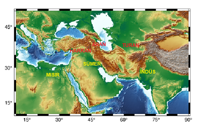 Şekil 24. Avrasya’nın genel genel görünümü ve Buzul Çağı sonrası (HARRAN; ARAN; TURAN) ve daha sonra Delta (MISIR; SÜMER; İNDÜS) uygarlıkları.