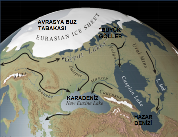 Kuvaterner süresince, Barents Denizi ve Kara Deniz (kuzeydeki) üzerinde yerleşen buzul tabakaları Rusya anakarasına doğru birçok kere genişlemiştir ve kuzeye doğru akan ırmakları durdurmuştur. Ters yönde akışı olan, örneğin Hazar ve Karadeniz’e yönelen, büyük buzul barajı arkasındaki bu göller bu buzul levhalarının güneyine yerleşmişlerdir (Grosswald, 1998 ve Mengerude ve diğ. 2004) (Şekil 4). Son Buzul Maksimumu (LGM, yaklaşık 20 bin yıl önce) süresince, Barents Denizi-Kara Denizuzul Tabakaları çok küçük olduğu için bu doğu ırmaklarını durduramamış ve saptıramamıştır. 90-80 ve 50-60 bin yıl öncesi maksimumların tersine, İskandinav Buzul Tabakası gereği kadar büyümüş olması nedeniyle ırmakları yönlendirmiştir. Akaçlama bölmesi Baltık Havza’sından İdil (Volga) Irmağına doğru yönelmiş ve sonuç olarak da Hazar Denizi’ne boşalmıştır. Bu taşkınlık Arktik Okyanusu ve daha geniş alandaki iklim üzerine belirgin etkisi olmuştur (Mangrude ve diğ. 2004).