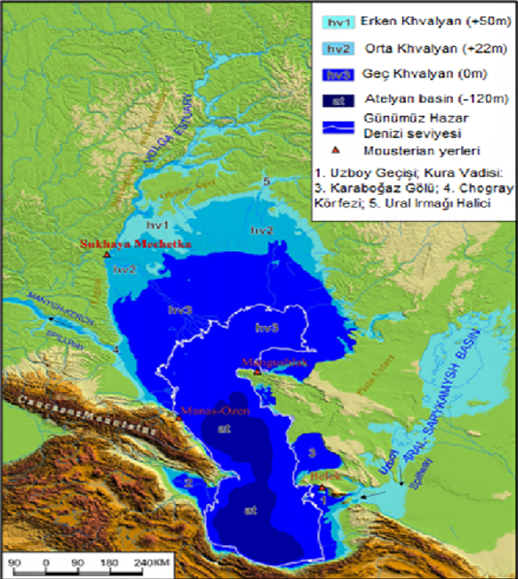 Son 15 bin yıl için Hazar Denizi bölgesindeki önemli olaylar: 15 bin yıl öncesi Khvalyan Yükselimi; 12 bin yıl öncesi buzul çağının sonu (Holosen Başlangıcı); 5-6 bin yıl öncesi günümüze yakın uygun değer deniz seviyesine ulaşım ve deltaların oluşmasına neden olmuştur (Şekil 23) Dünya uygarlıkları aşağıdaki şekilde özetlenebilir: