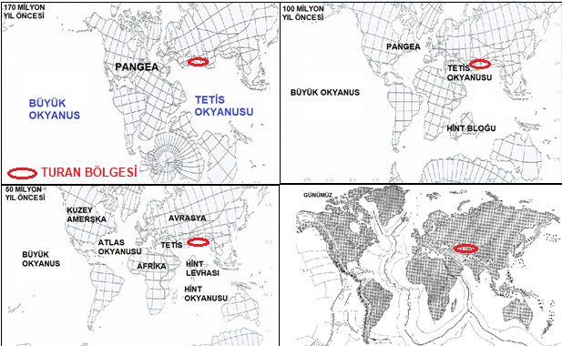 Günümüzden 170 milyon yıl öce tüm kutalar bir arada idi ve PANGEA olarak biliniyordu. İki tarafından Büyük ve Tetis Okyanusları çevreliyordu. Bundan sonra kıtalar ayrışmaya başlamıştır. Sonucu olaraktan Tetis Okyanusu kapanmaya başlamıştır (Şekil. 7). Tetis Okyanusu kapanırken onun üzerine Alp-Himalaya kuşağı oluşmuştur. Tetis Okyanusu kalıntıları Doğu Akdeniz, Karadeniz ve Güney Hazar Denizi’dir. Hazar Denizi ve Turan havzası Alp-Himalaya kuşağının kuzeyindedir.