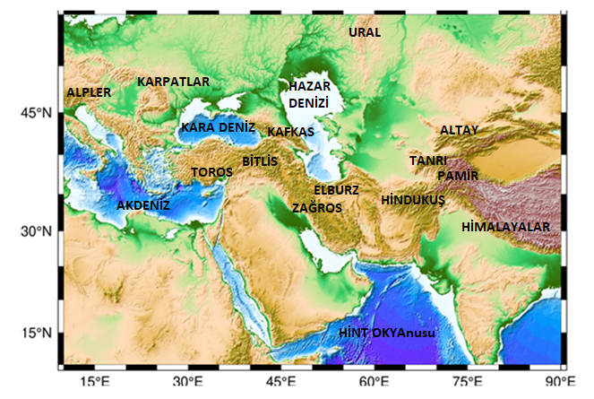 Doğu Akdeniz ve Ortadoğu, son 200 milyon yıldır Pangea’nın (tüm kıtalar bir arada) parçalanması ve Tetis Okyanusu’nun kapanması sonucu Tetis Okyanusu’nun güney kanadını oluşturmaktadır. Bu kuşak Girit ve Kıbrıs yayları, Doğu Anadolu Fay Zonu, Bitlis Büklüm Zonu ve Zağros Dağlarını içermektedir. Tetis Okyanusunun kuzey sınırı Hazar Denizi ve Karadeniz olup İtalya’daki Po vadisine kadar uzanmaktadır (Kuzey Anadolu Dağları, Kafkaslar ve Elburz Dağları). Bu iki zon arasında Balkan, Anadolu ve İran platoları ise kapanan Tetis Okyanusunun kalıntıları üzerinde yer almaktadırlar. Ortadoğu ve Orta Asya’nın aktif tektoniği, genel olarak güneyde Afrika, Arap ve Hint levhalarının kuzeye ilerlemesi ve Avrasya levhasının sıkıştırması sonucu gelişmiştir.