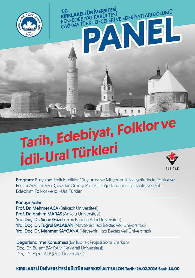 Kırklareli Üniversitesi Fen-Edebiyat Fakültesi, Çağdaş Türk Lehçeleri ve Edebiyatları Bölümünün düzenlemiş olduğu ve Prof. Dr. Mehmet AÇA, Prof. Dr. İbrahim MARAŞ, Doç Dr. Bülent BAYRAM, Doç. Dr. Alper ALP, Yrd. Doç. Dr. Sinan GÜZEL, Yrd. Doç. Dr. Tuğrul BALABAN ile Yrd. Doç. Dr. Mehmet KAYGANA’nın konuşmacı olarak katıldığı “Tarih, Edebiyat, Folklor ve İdil Ural Türkleri Paneli”, 26.02.2016 tarihinde, saat 14.00’te Kırklareli Üniversitesi Rektörlüğü Kültür Merkezi, Alt Salonda gerçekleştirilecektir. Tüm akademisyenlerimiz ve öğrencilerimiz panele davetlidir.