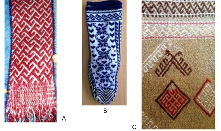 Şekil 7 – (A) dokumadan ayrıntı, (Novosibirsk-Batı Sibirya); (B) Çorap (Çamlıhemşin-Rize); (C) Bir kilimden ayrıntı, (Isparta) (Resimler, Mustafa Aksoy özel arşivinden alınmıştır).