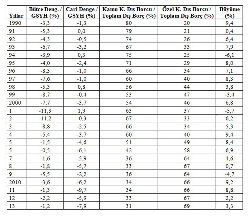 Tablodan dış borçlanmanın ağırlığının kamu kesiminden özel kesime geçmiş olduğu açık bir biçimde görülebiliyor. 1990 yılında Türkiye’nin toplam dış borç stoku 49 milyar dolar iken bu tutar 2002’de 130 milyar dolara, 2013’de 373 milyar dolara çıkmıştır. Dolayısıyla düşük kalmış bir dış borç stoku içinde kamu kesimi payı ile özel kesim payı yer değiştirmiş değildir. Bir yandan dış borç stoku artarken bir yandan da bunun içinde özel kesim payı hızla yükselmiş durumdadır.