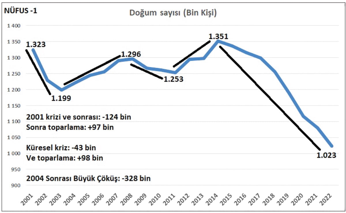 Önce birkaç not: Nüfus-1 grafiğinde görüyorsunuz. Ekonomi bozulunca düşen doğum sayısı, ekonomi düzelince yeniden artıyor. Ama 2014 sonrası adeta yerle bir olduk. 1 milyon 351 bin olan doğum sayısı 2022 yılında 1 milyon 023 bine geriledi.