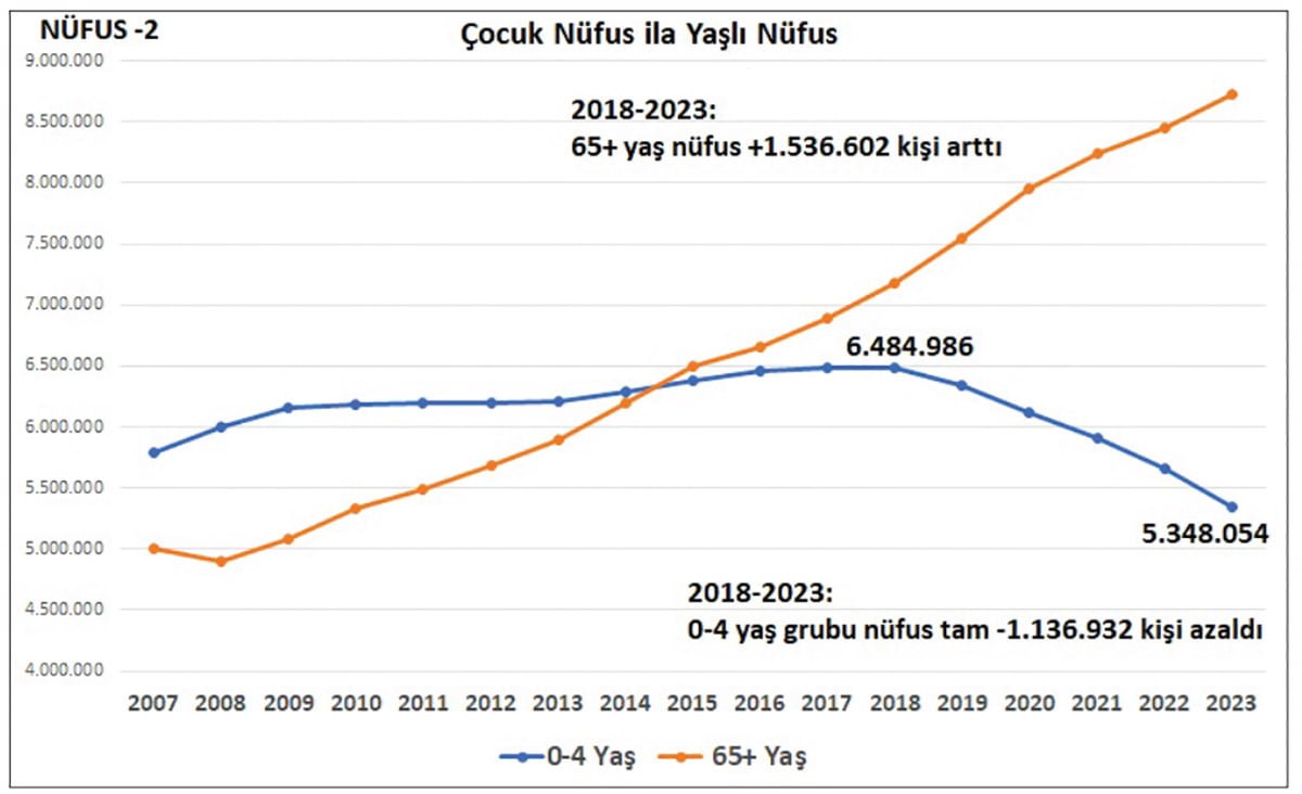 2018-2023 yılları içinde ülkemizde 0-4 yaş çocuk nüfusu -1 milyon 137 bin kişi azalıyor. Oysa aynı dönemde 65+ yaş nüfus dediğimiz yaşlı nüfus 1 milyon 537 bin kişi artıyor.