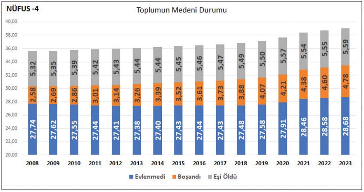 2008 yılında ülkemizde evlilik çağındaki nüfusun yüzde 64,4’ü aile sahibiymiş. Nüfus -4 grafiğinde boşanma ve bekar durumları var ama evli olma durumu zaten bunların dışında kalan kısım. İşte orada şunu görüyoruz: